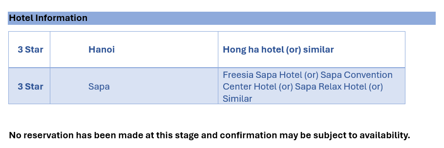 · ရန်ကုန်အပြည်ပြည်ဆိုင်ရာလေဆိပ်မှ သတ်မှတ်ထားသော လေကြောင်းလိုင်းဖြင့် ဗီယက်နမ်နိုင်ငံ ဟနွိုင်းမြို့သို့ ထွက်ခွာပါမည်။ · ဟနွိုင်းအပြည်ပြည်ဆိုင်ရာလေဆိပ်သို့ ရောက်ရှိသောအခါ ဒေသခံဧည့်လမ်းညွှန်မှ နွေးထွေးပြူငှာစွာ လာရောက်ကြိုဆိုမည်ဖြစ်ပြီး ထိုမှတဆင့် ညစာသုံးဆောင်ရန် ဒေသစားသောက်ဆိုင်သို့ ပို့ဆောင်ပေးမည် ဖြစ်ပါသည်။ · ညစာသုံးဆောင်ပြီးနောက် ဟိုတယ်သို့ ပို့ဆောင်ပေးကာ check in ဝင်ပြီး တစ်ညတာအား ဟိုတယ်တွင် အိပ်စက်အနားယူပါမည်။
